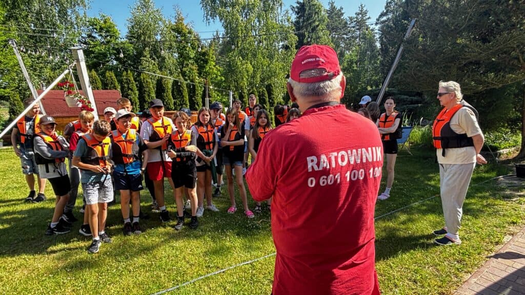 Organizator zapewnia podstawowy sprzęt: kajaki lub pontony, wiosła i kamizelki ratunkowe, a także instruktorów i ratownika. Każdy spływ zaczyna się od szkolenia z zasad bezpieczeństwa: jak zachować równowagę, jak reagować w razie przewrócenia i jak poruszać się w szyku grupy. Dzieciom tłumaczy się również zasady zachowania na brzegu i konieczność słuchania opiekunów. Ubezpieczenie i opieka medyczna podczas imprezy to standard w ofercie dla szkół.